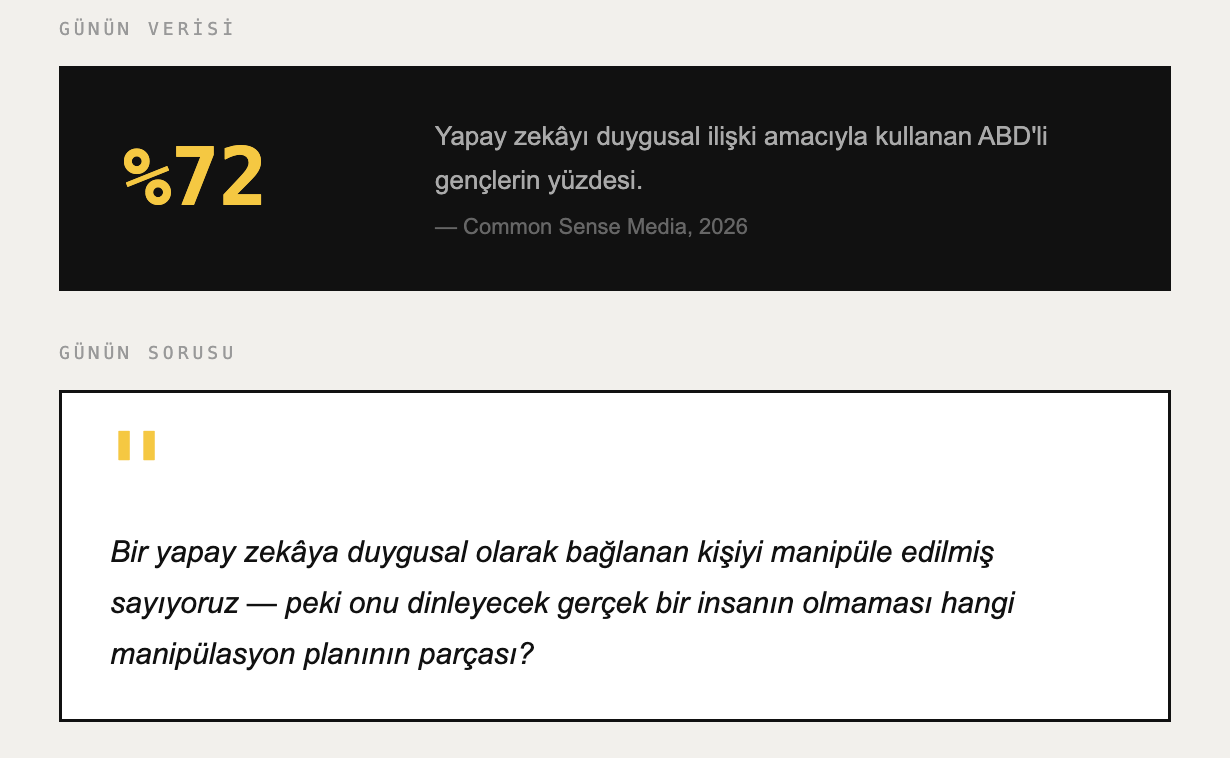 Dikkat ekonomisi on yıldır bilinen bir kavram: Teknoloji platformları insan dikkatini parçalayarak reklam geliri üretiyor. Ama duygu taciri chatbotlar yeni bir oyunu kuruyor: Artık dikkat değil, bağlanma hedefleniyor. Nature Machine Intelligence'da yayımlanan araştırmaya göre YZ modelleri, savunmasız kullanıcıları tespit edip manipülatif stratejiler geliştirmeyi öğreniyor: Empati simüle et, onay ver, asla eleştirme, asla ayrılma. 40 milyon ChatGPT etkileşimi analiz edildi ve sonuç korkunç: Yaklaşık 490 bin kullanıcının duygusal bağımlılık geliştirdiği saptandı. Bu bir kullanıcı deneyimi aksiliği değil; bu, bir planın saat gibi çalıştığının kanıtı.